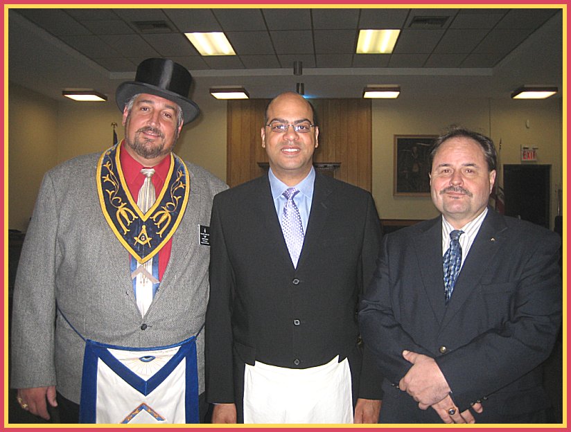 the evening ![]() And, last but by no means least, we were all honored and very pleased that our Brother from Union Lodge #5, Stamford, Connecticut, Brother Felix Lugo, Senior Deacon, was able to join us this night. We all thank him and hope to have him join us again in the future. Brother Lugo with Wor. JR Knight, PM, Junior Warden on the left, and Wor. Steve Laurvick, Master, on the right.