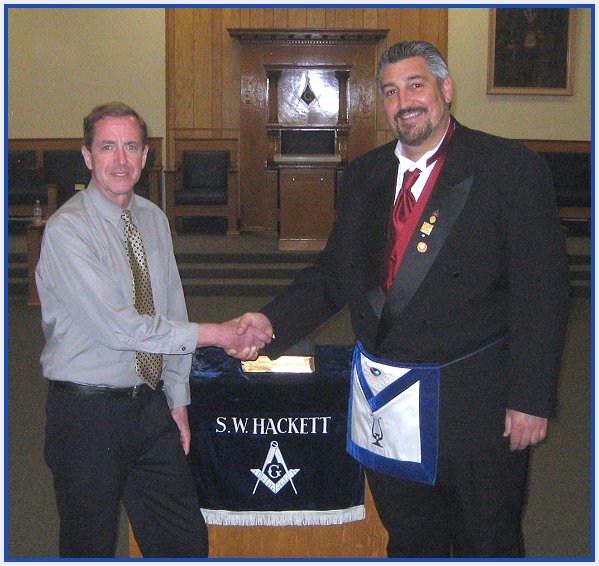 Worshipful William "JR" Knight, PM, Master, congratulates Brother Bridges.