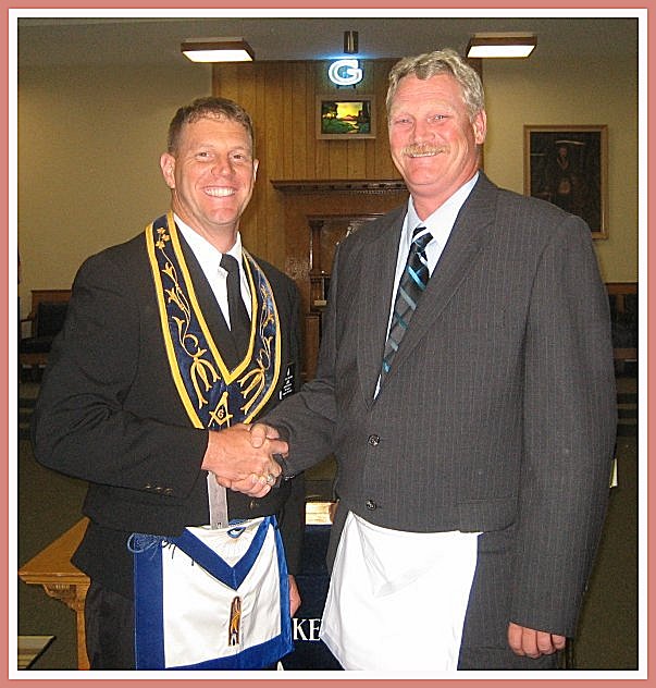 ![]() Wor. Bro. Jim Achenbach, PM, Treasurer congratulates his friend, Brother Eric Kurzenberger.