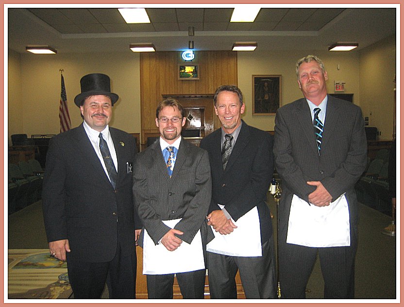 ![]() Wor. Steve Laurvick, Master, with our newly passed Fellow Crafts, Brothers Eric Kurzenberger, Steven "Tex" Perry and Robert Gale ![]() Our newly passed fellow Crafts, Bro. Eric Kurzenberger, Bro. Robert Gale and Bro. Tex Perry.