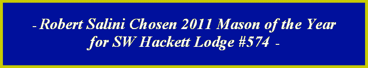 It was announced on, June 7,2011, that Brother Robert Salini was chosen as the SW Hackett Lodge #574 Mason of the Year. Then on this night September 3rd, the award was presented by the Most Worshipful William J. Bray III at the Grand Master's reception and dinner. Brother Salini, our Junior Deacon, was awarded this honor for his involvement not only in Lodge activities and his work in the line and his desire to progress through the line, but also for his tireless assistance with any and all community involvement. He is always willing to help with programs that help others in the San Diego area and projects a very positive image of Masonry. Brother Salini was initiated in SW Hackett Lodge on July 21st, 2009. He was passed to Fellow Craft on November 24th and raised to Master Mason on February 16th, 2010.