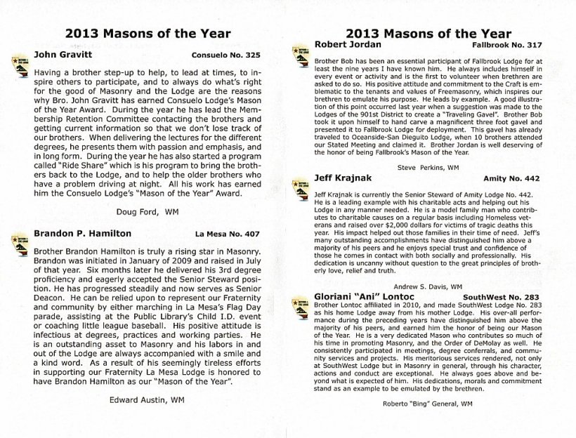 Worshipful Clint Black, PM and Judy helped make this a great event. Below are the 2013 Masons of the Year for Division IX.