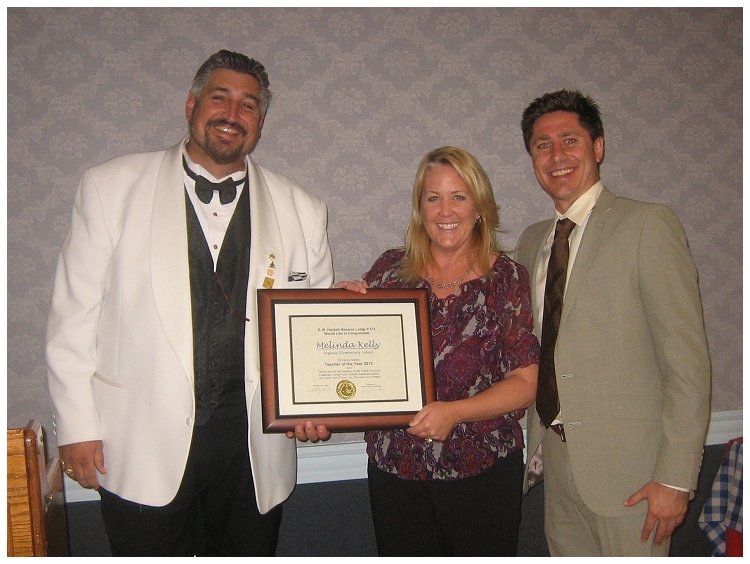 Worshipful Jim Achenbach joins in the celebration and poses with the Teacher of the Year as Worshipful Knight presents the good stuff..... The monetary award.